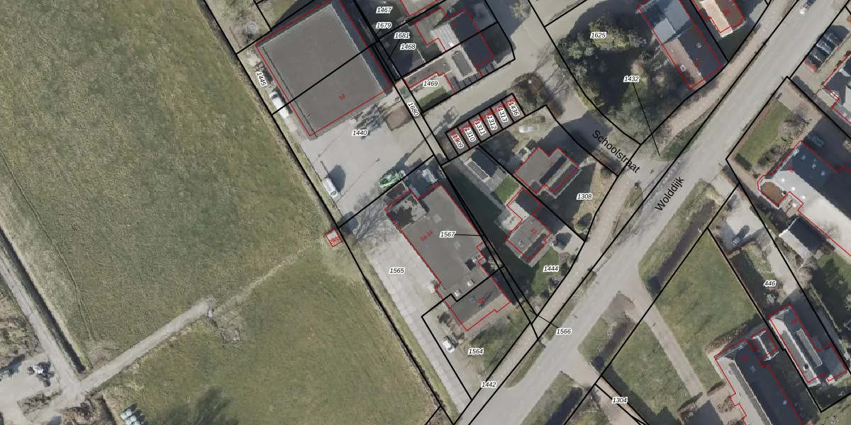 Het perceel waarop Schoolstraat 1-c staat heeft een oppervlakte van 985 m². Dit is een groot perceel. De perceeloppervlakte wordt geregistreerd door het Kadaster. Gedetailleerde informatie over de maten van dit perceel kunt u vinden in het rapport Kadastrale kaart met maatvoering van Schoolstraat 1-c.