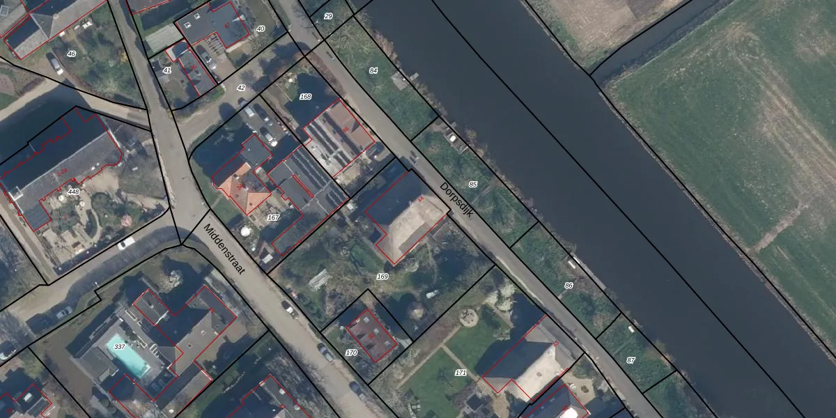 Het perceel waarop Dorpsdijk 44 staat heeft een oppervlakte van 1235 m². Dit is een zeer groot perceel. De perceeloppervlakte wordt geregistreerd door het Kadaster. Gedetailleerde informatie over de maten van dit perceel kunt u vinden in het rapport Kadastrale kaart met maatvoering van Dorpsdijk 44.