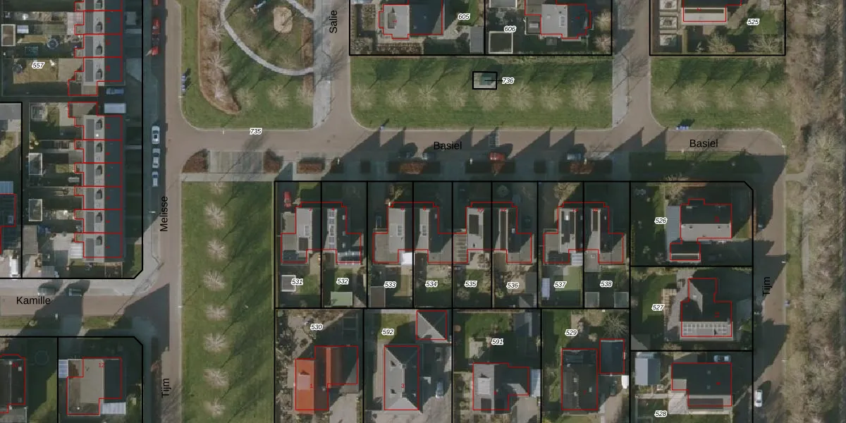 Het perceel waarop Basiel 8 staat heeft een oppervlakte van 279 m². Dit is een middelgroot perceel. De perceeloppervlakte wordt geregistreerd door het Kadaster. Gedetailleerde informatie over de maten van dit perceel kunt u vinden in het rapport Kadastrale kaart met maatvoering van Basiel 8.
