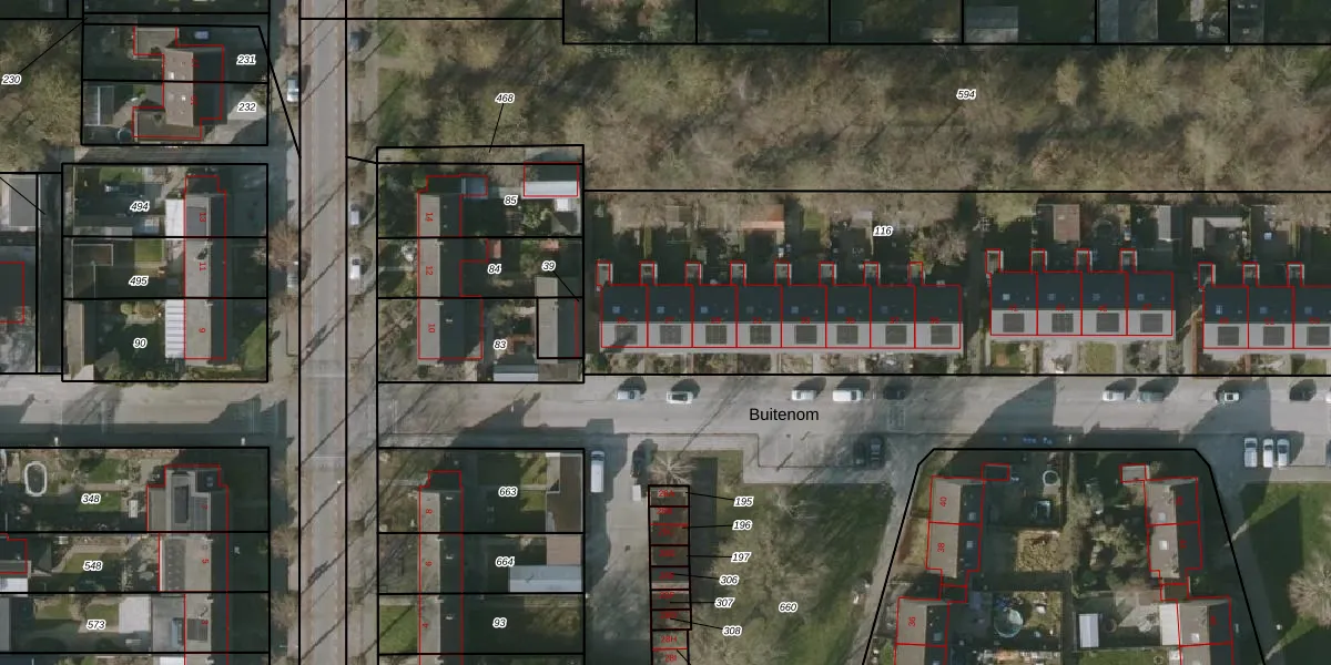 Het perceel waarop Buitenom 27 staat heeft een oppervlakte van 3743 m². Dit is een zeer groot perceel. De perceeloppervlakte wordt geregistreerd door het Kadaster. Gedetailleerde informatie over de maten van dit perceel kunt u vinden in het rapport Kadastrale kaart met maatvoering van Buitenom 27.