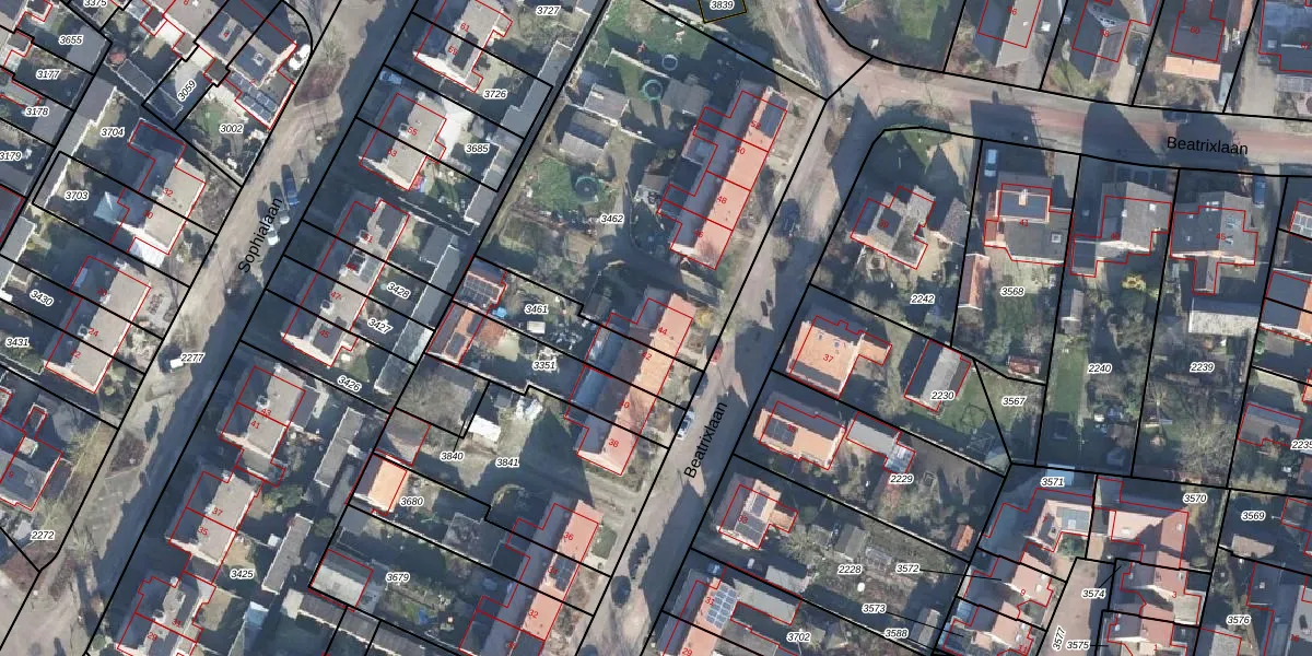 Het perceel waarop Beatrixlaan 44 staat heeft een oppervlakte van 1743 m². Dit is een zeer groot perceel. De perceeloppervlakte wordt geregistreerd door het Kadaster. Gedetailleerde informatie over de maten van dit perceel kunt u vinden in het rapport Kadastrale kaart met maatvoering van Beatrixlaan 44.