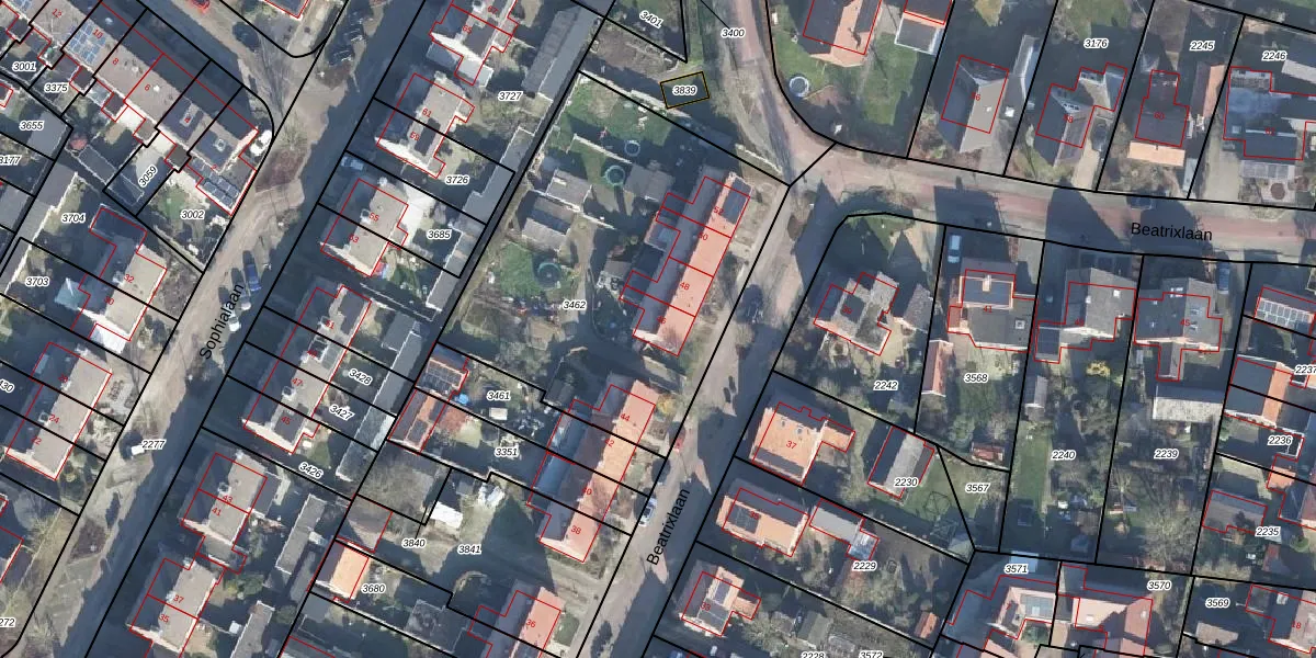 Het perceel waarop Beatrixlaan 46 staat heeft een oppervlakte van 1743 m². Dit is een zeer groot perceel. De perceeloppervlakte wordt geregistreerd door het Kadaster. Gedetailleerde informatie over de maten van dit perceel kunt u vinden in het rapport Kadastrale kaart met maatvoering van Beatrixlaan 46.