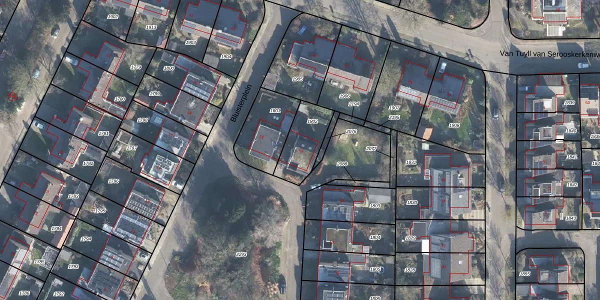 Het perceel waarop Bluisterplein 21 staat heeft een oppervlakte van 310 m². Dit is een groot perceel. De perceeloppervlakte wordt geregistreerd door het Kadaster. Gedetailleerde informatie over de maten van dit perceel kunt u vinden in het rapport Kadastrale kaart met maatvoering van Bluisterplein 21.