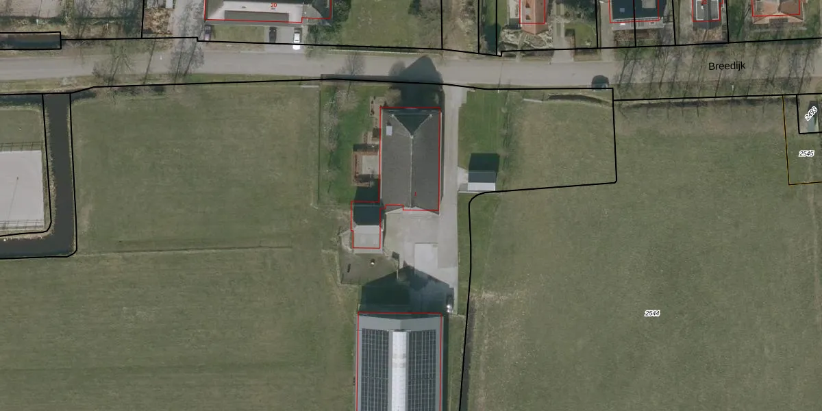 Het perceel waarop Breedijk 1 staat heeft een oppervlakte van 3,7 ha. Dit is een zeer groot perceel. De perceeloppervlakte wordt geregistreerd door het Kadaster. Gedetailleerde informatie over de maten van dit perceel kunt u vinden in het rapport Kadastrale kaart met maatvoering van Breedijk 1.