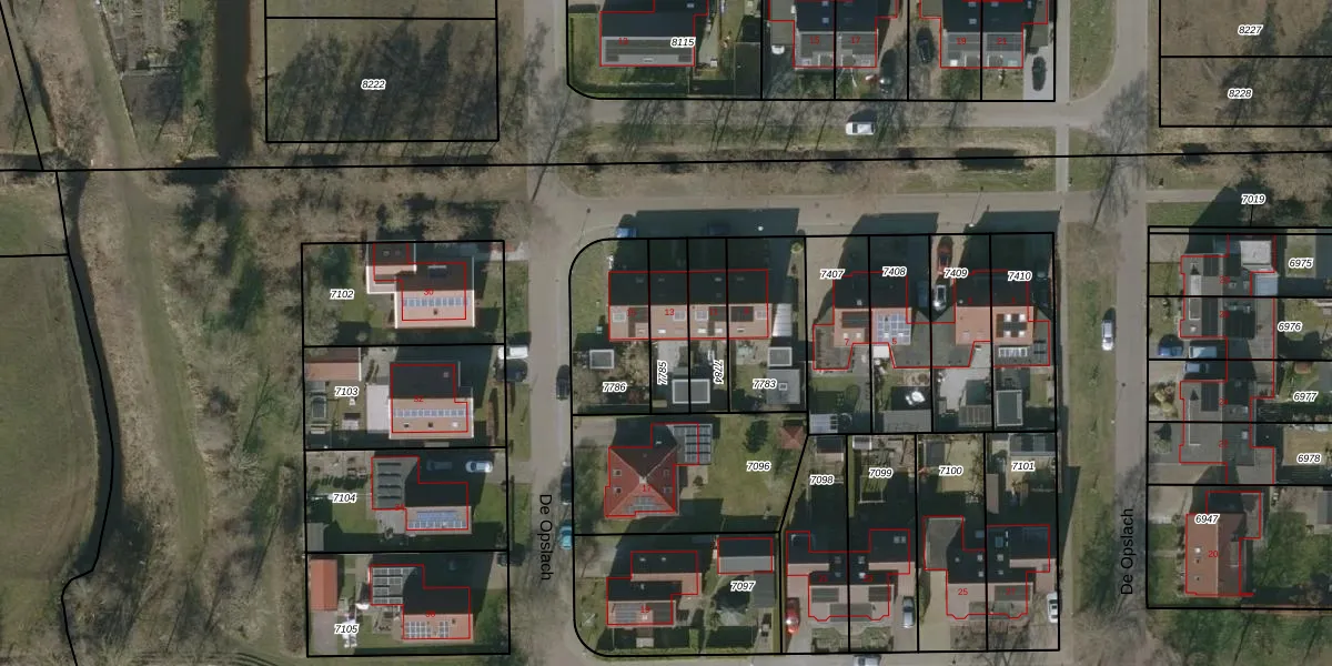 Het perceel waarop De Opslach 13 staat heeft een oppervlakte van 155 m². Dit is een middelgroot perceel. De perceeloppervlakte wordt geregistreerd door het Kadaster. Gedetailleerde informatie over de maten van dit perceel kunt u vinden in het rapport Kadastrale kaart met maatvoering van De Opslach 13.