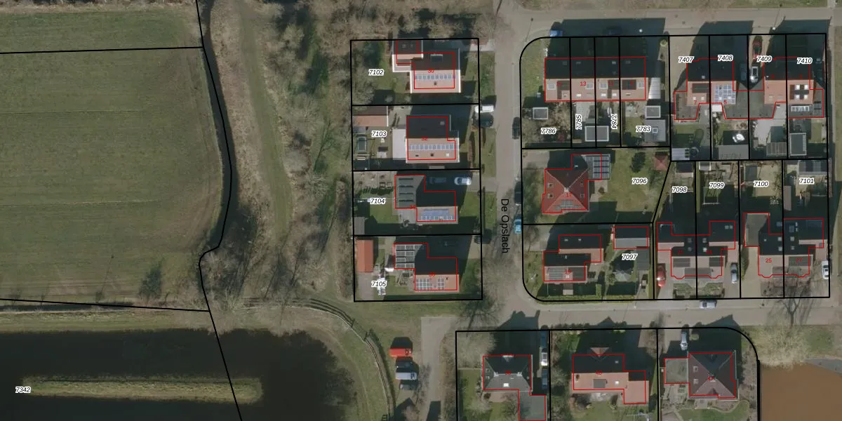 Het perceel waarop De Opslach 34 staat heeft een oppervlakte van 470 m². Dit is een groot perceel. De perceeloppervlakte wordt geregistreerd door het Kadaster. Gedetailleerde informatie over de maten van dit perceel kunt u vinden in het rapport Kadastrale kaart met maatvoering van De Opslach 34.