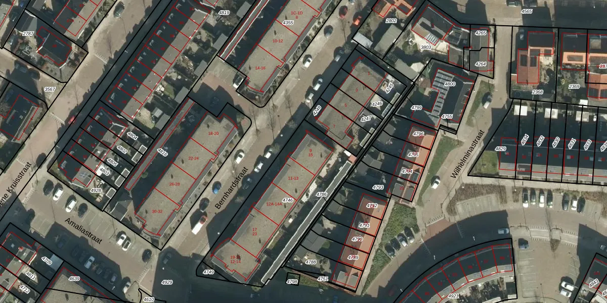 Het perceel waarop Bernhardstraat 9 staat heeft een oppervlakte van 1347 m². Dit is een zeer groot perceel. De perceeloppervlakte wordt geregistreerd door het Kadaster. Gedetailleerde informatie over de maten van dit perceel kunt u vinden in het rapport Kadastrale kaart met maatvoering van Bernhardstraat 9.