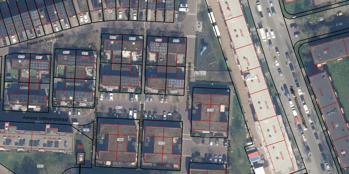 Aeneas Veltkampstraat 1 is gelegen op kadastraal perceel LDN03H8030. Deze kadastrale aanduiding is uniek en wordt gebruikt door het Kadaster om eigendomsrechten en andere zakelijke rechten vast te leggen. Het perceel maakt onderdeel uit van de kadastrale gemeente Loosduinen.