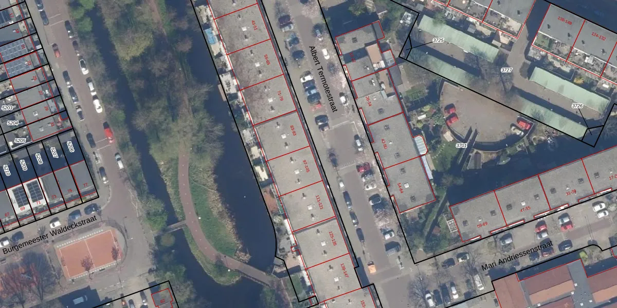 Het perceel waarop Albert Termotestraat 101 staat heeft een oppervlakte van 4013 m². Dit is een zeer groot perceel. De perceeloppervlakte wordt geregistreerd door het Kadaster. Gedetailleerde informatie over de maten van dit perceel kunt u vinden in het rapport Kadastrale kaart met maatvoering van Albert Termotestraat 101.
