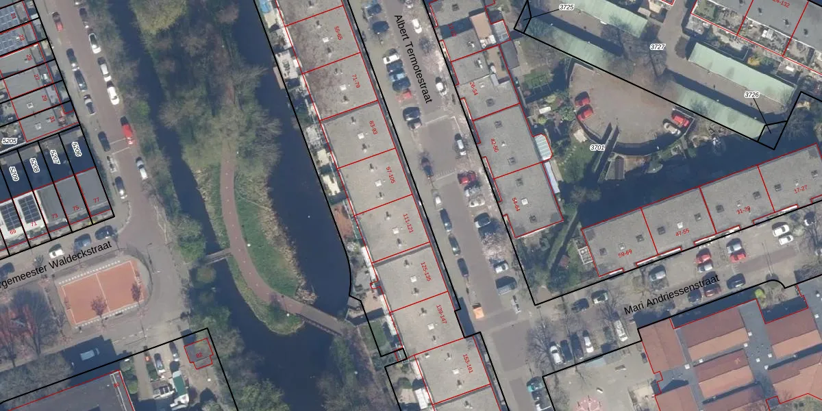 Albert Termotestraat 111 is gelegen op kadastraal perceel LDN03M3387. Deze kadastrale aanduiding is uniek en wordt gebruikt door het Kadaster om eigendomsrechten en andere zakelijke rechten vast te leggen. Het perceel maakt onderdeel uit van de kadastrale gemeente Loosduinen.