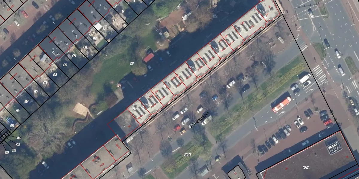 Het perceel waarop Almeloplein 36 staat heeft een oppervlakte van 9113 m². Dit is een zeer groot perceel. De perceeloppervlakte wordt geregistreerd door het Kadaster. Gedetailleerde informatie over de maten van dit perceel kunt u vinden in het rapport Kadastrale kaart met maatvoering van Almeloplein 36.