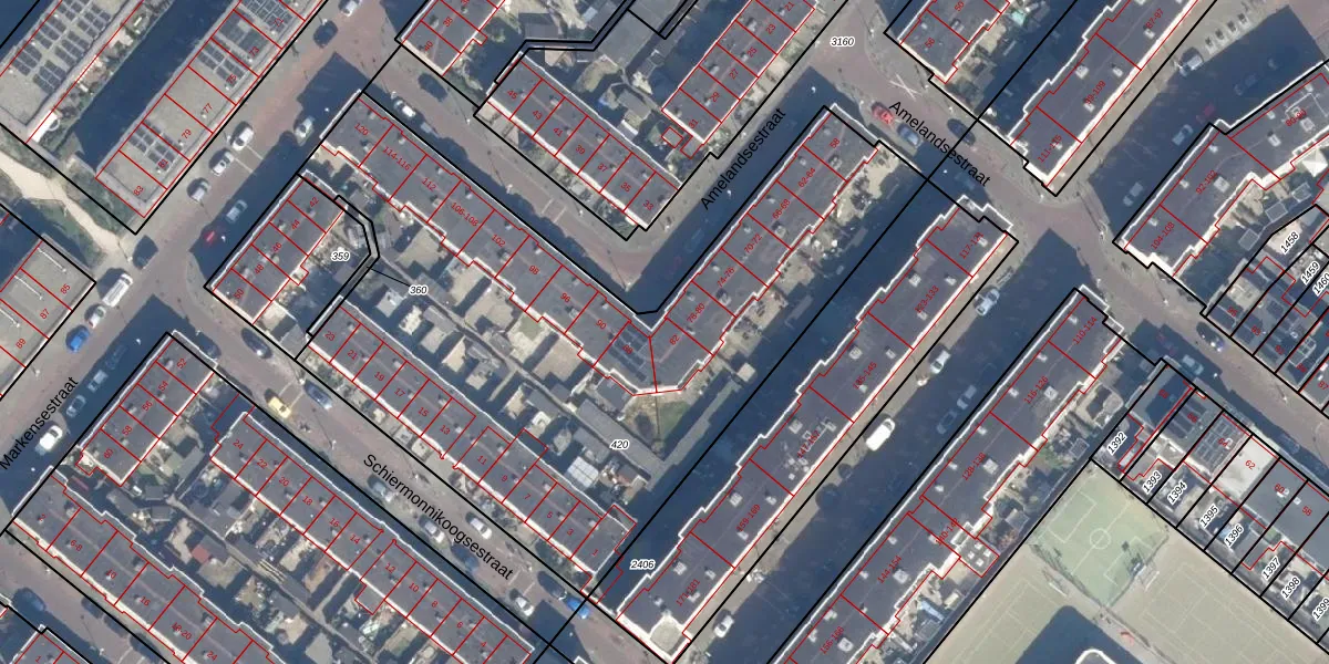 Het perceel waarop Amelandsestraat 82 staat heeft een oppervlakte van 3249 m². Dit is een zeer groot perceel. De perceeloppervlakte wordt geregistreerd door het Kadaster. Gedetailleerde informatie over de maten van dit perceel kunt u vinden in het rapport Kadastrale kaart met maatvoering van Amelandsestraat 82.