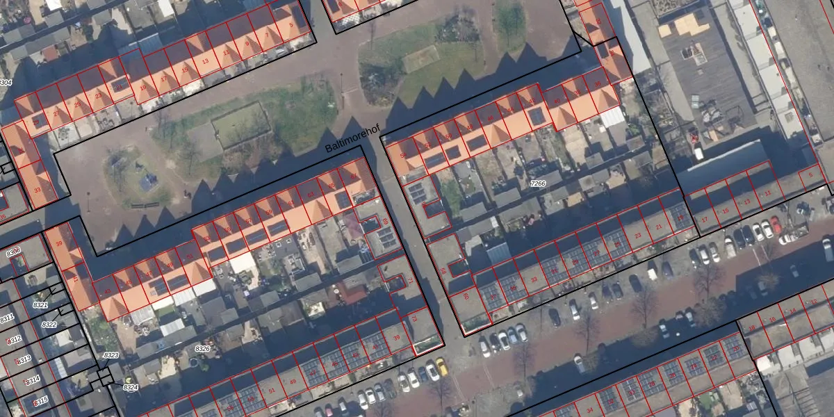 Het perceel waarop Baltimorehof 56 staat heeft een oppervlakte van 3225 m². Dit is een zeer groot perceel. De perceeloppervlakte wordt geregistreerd door het Kadaster. Gedetailleerde informatie over de maten van dit perceel kunt u vinden in het rapport Kadastrale kaart met maatvoering van Baltimorehof 56.
