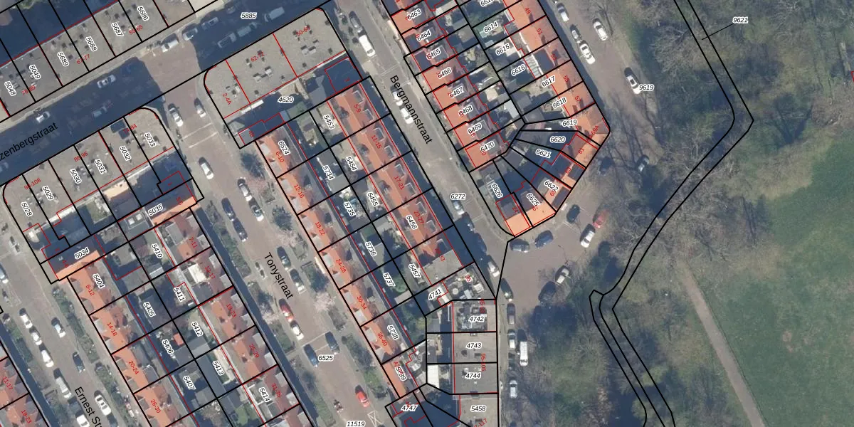 Het perceel waarop Bergmannstraat 23 staat heeft een oppervlakte van 165 m². Dit is een middelgroot perceel. De perceeloppervlakte wordt geregistreerd door het Kadaster. Gedetailleerde informatie over de maten van dit perceel kunt u vinden in het rapport Kadastrale kaart met maatvoering van Bergmannstraat 23.