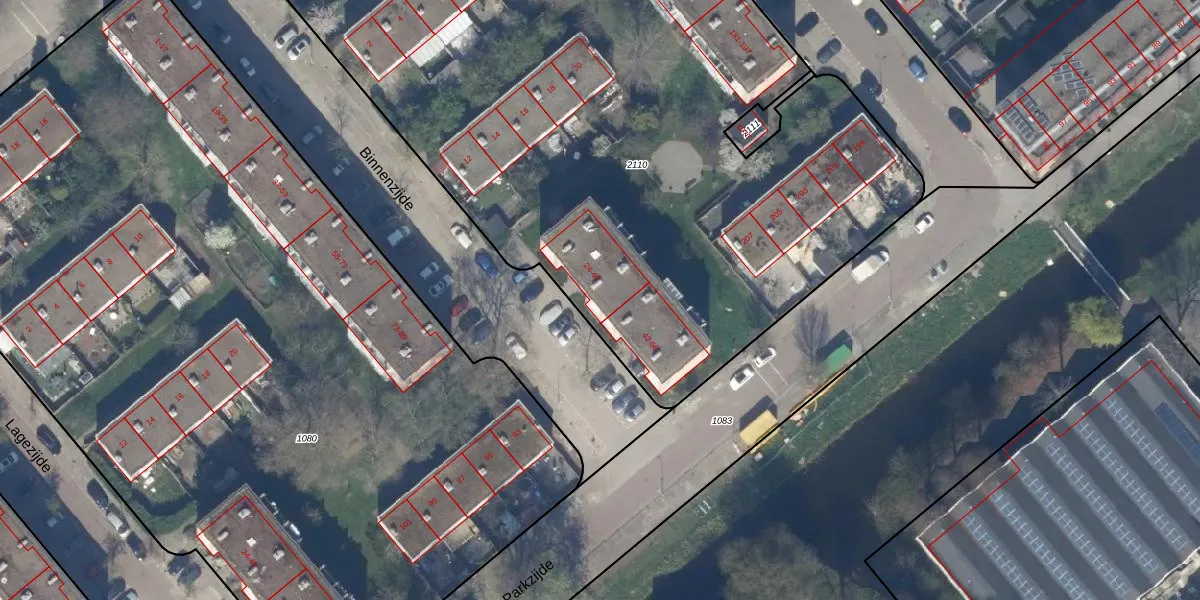 Het perceel waarop Binnenzijde 34 staat heeft een oppervlakte van 6536 m². Dit is een zeer groot perceel. De perceeloppervlakte wordt geregistreerd door het Kadaster. Gedetailleerde informatie over de maten van dit perceel kunt u vinden in het rapport Kadastrale kaart met maatvoering van Binnenzijde 34.