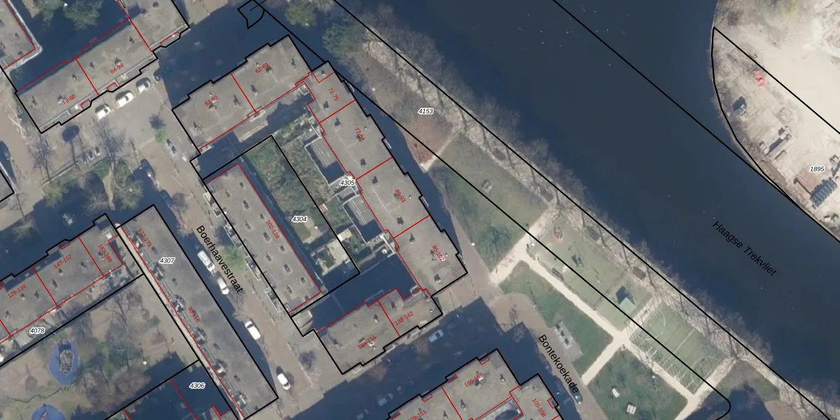 Bontekoekade 91 is gelegen op kadastraal perceel GVH21AD4305. Deze kadastrale aanduiding is uniek en wordt gebruikt door het Kadaster om eigendomsrechten en andere zakelijke rechten vast te leggen. Het perceel maakt onderdeel uit van de kadastrale gemeente 's-Gravenhage.