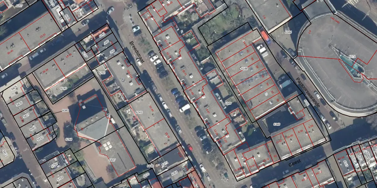 Breedstraat 43 is gelegen op kadastraal perceel GVH00C6349. Deze kadastrale aanduiding is uniek en wordt gebruikt door het Kadaster om eigendomsrechten en andere zakelijke rechten vast te leggen. Het perceel maakt onderdeel uit van de kadastrale gemeente 's-Gravenhage.