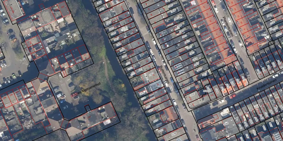Het perceel waarop Buitentuinen 21-B staat heeft een oppervlakte van 90 m². Dit is een klein perceel. De perceeloppervlakte wordt geregistreerd door het Kadaster. Gedetailleerde informatie over de maten van dit perceel kunt u vinden in het rapport Kadastrale kaart met maatvoering van Buitentuinen 21-B.