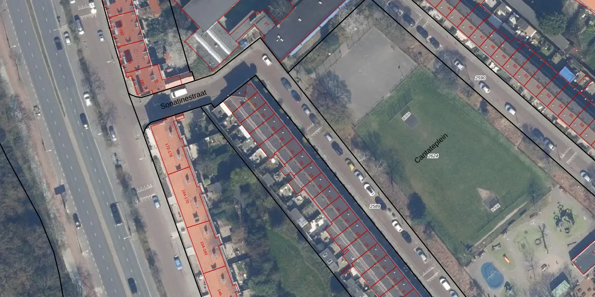 Het perceel waarop Cantateplein 21 staat heeft een oppervlakte van 2790 m². Dit is een zeer groot perceel. De perceeloppervlakte wordt geregistreerd door het Kadaster. Gedetailleerde informatie over de maten van dit perceel kunt u vinden in het rapport Kadastrale kaart met maatvoering van Cantateplein 21.
