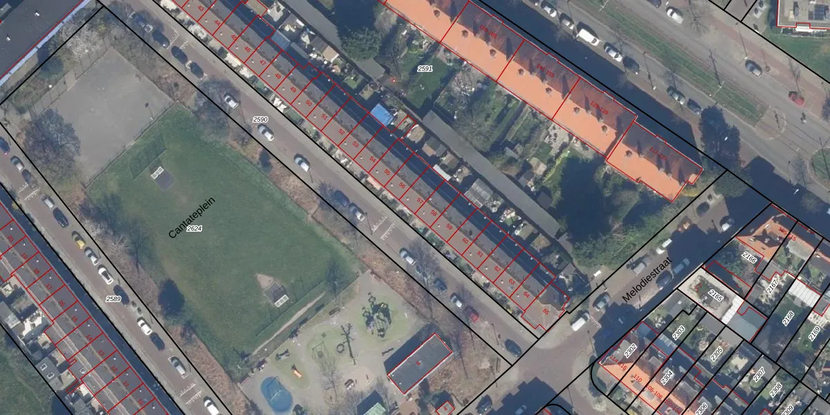Het perceel waarop Cantateplein 57 staat heeft een oppervlakte van 7143 m². Dit is een zeer groot perceel. De perceeloppervlakte wordt geregistreerd door het Kadaster. Gedetailleerde informatie over de maten van dit perceel kunt u vinden in het rapport Kadastrale kaart met maatvoering van Cantateplein 57.