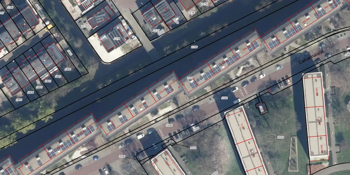 Het perceel waarop Catharinaland 180 staat heeft een oppervlakte van 8215 m². Dit is een zeer groot perceel. De perceeloppervlakte wordt geregistreerd door het Kadaster. Gedetailleerde informatie over de maten van dit perceel kunt u vinden in het rapport Kadastrale kaart met maatvoering van Catharinaland 180.