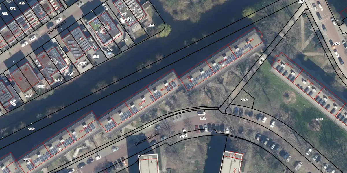 Het perceel waarop Catharinaland 314 staat heeft een oppervlakte van 8215 m². Dit is een zeer groot perceel. De perceeloppervlakte wordt geregistreerd door het Kadaster. Gedetailleerde informatie over de maten van dit perceel kunt u vinden in het rapport Kadastrale kaart met maatvoering van Catharinaland 314.