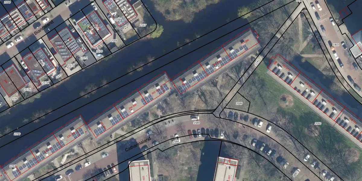 Het perceel waarop Catharinaland 330 staat heeft een oppervlakte van 8215 m². Dit is een zeer groot perceel. De perceeloppervlakte wordt geregistreerd door het Kadaster. Gedetailleerde informatie over de maten van dit perceel kunt u vinden in het rapport Kadastrale kaart met maatvoering van Catharinaland 330.