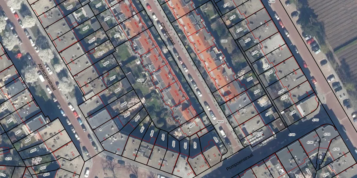 Het perceel waarop Citroenstraat 24 staat heeft een oppervlakte van 1538 m². Dit is een zeer groot perceel. De perceeloppervlakte wordt geregistreerd door het Kadaster. Gedetailleerde informatie over de maten van dit perceel kunt u vinden in het rapport Kadastrale kaart met maatvoering van Citroenstraat 24.