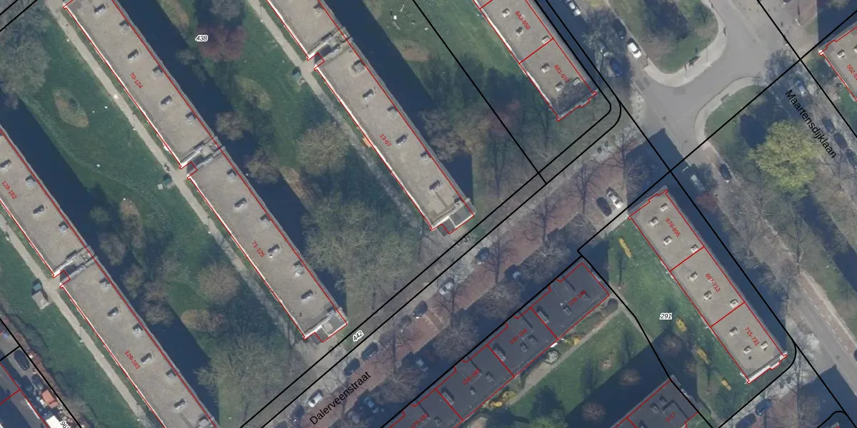 Het perceel waarop Dalerveenstraat 55 staat heeft een oppervlakte van 1,3 ha. Dit is een zeer groot perceel. De perceeloppervlakte wordt geregistreerd door het Kadaster. Gedetailleerde informatie over de maten van dit perceel kunt u vinden in het rapport Kadastrale kaart met maatvoering van Dalerveenstraat 55.