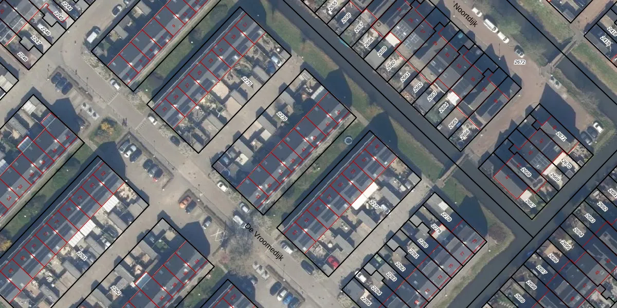 Het perceel waarop De Vroomedijk 41 staat heeft een oppervlakte van 1010 m². Dit is een zeer groot perceel. De perceeloppervlakte wordt geregistreerd door het Kadaster. Gedetailleerde informatie over de maten van dit perceel kunt u vinden in het rapport Kadastrale kaart met maatvoering van De Vroomedijk 41.