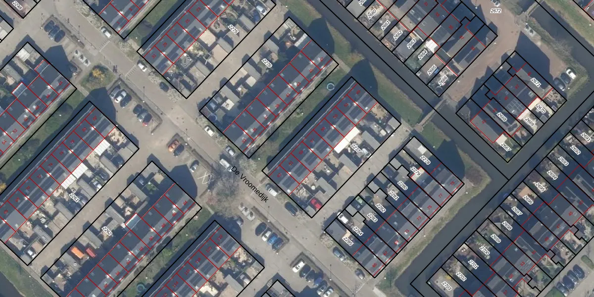 Het perceel waarop De Vroomedijk 59 staat heeft een oppervlakte van 1010 m². Dit is een zeer groot perceel. De perceeloppervlakte wordt geregistreerd door het Kadaster. Gedetailleerde informatie over de maten van dit perceel kunt u vinden in het rapport Kadastrale kaart met maatvoering van De Vroomedijk 59.