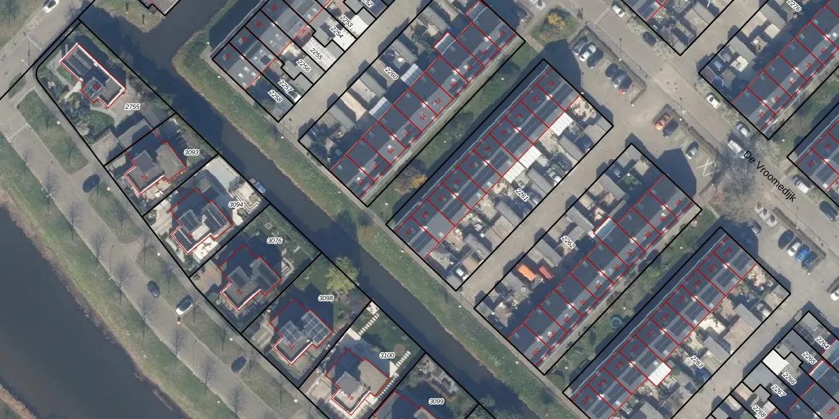 Het perceel waarop De Vroomedijk 66 staat heeft een oppervlakte van 1260 m². Dit is een zeer groot perceel. De perceeloppervlakte wordt geregistreerd door het Kadaster. Gedetailleerde informatie over de maten van dit perceel kunt u vinden in het rapport Kadastrale kaart met maatvoering van De Vroomedijk 66.