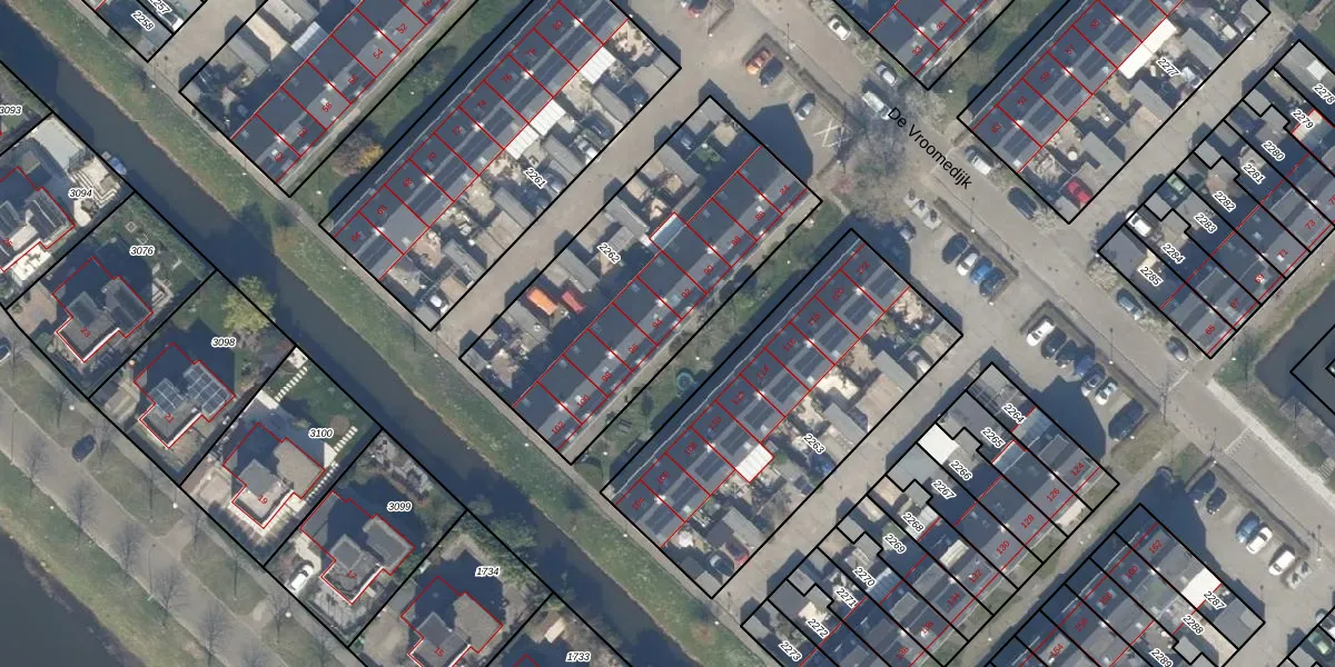 Het perceel waarop De Vroomedijk 94 staat heeft een oppervlakte van 1260 m². Dit is een zeer groot perceel. De perceeloppervlakte wordt geregistreerd door het Kadaster. Gedetailleerde informatie over de maten van dit perceel kunt u vinden in het rapport Kadastrale kaart met maatvoering van De Vroomedijk 94.