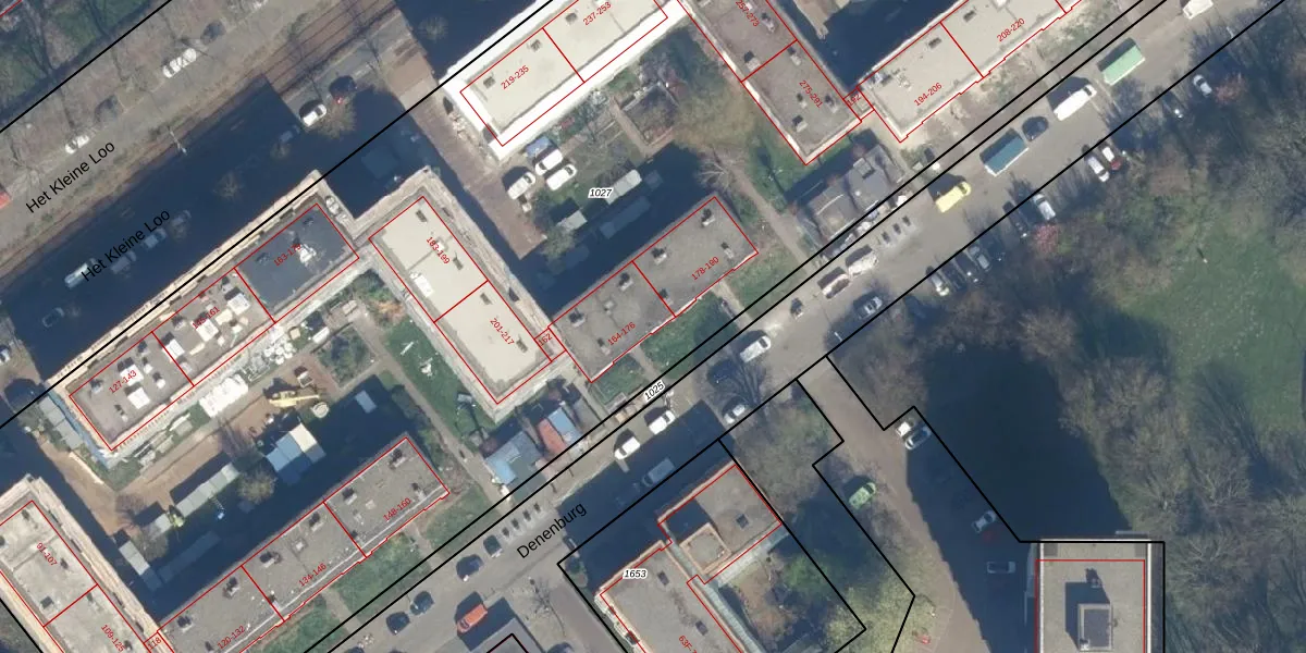 Het perceel waarop Denenburg 174 staat heeft een oppervlakte van 1,3 ha. Dit is een zeer groot perceel. De perceeloppervlakte wordt geregistreerd door het Kadaster. Gedetailleerde informatie over de maten van dit perceel kunt u vinden in het rapport Kadastrale kaart met maatvoering van Denenburg 174.