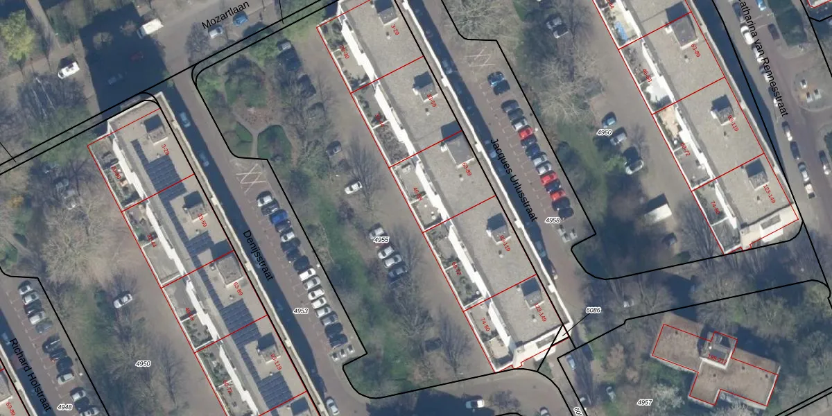 Het perceel waarop Denijsstraat 54 staat heeft een oppervlakte van 4537 m². Dit is een zeer groot perceel. De perceeloppervlakte wordt geregistreerd door het Kadaster. Gedetailleerde informatie over de maten van dit perceel kunt u vinden in het rapport Kadastrale kaart met maatvoering van Denijsstraat 54.