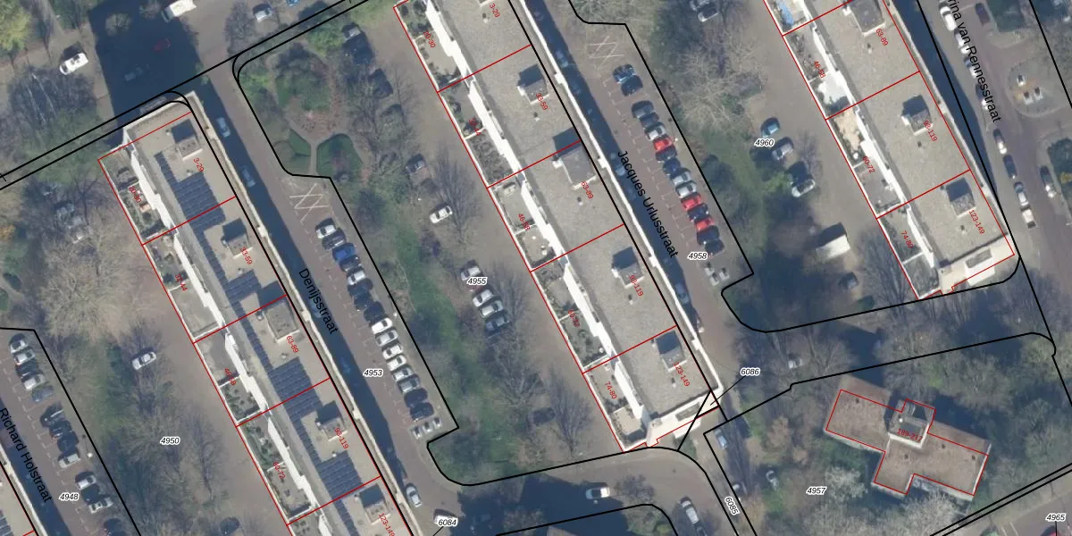 Het perceel waarop Denijsstraat 58 staat heeft een oppervlakte van 4537 m². Dit is een zeer groot perceel. De perceeloppervlakte wordt geregistreerd door het Kadaster. Gedetailleerde informatie over de maten van dit perceel kunt u vinden in het rapport Kadastrale kaart met maatvoering van Denijsstraat 58.