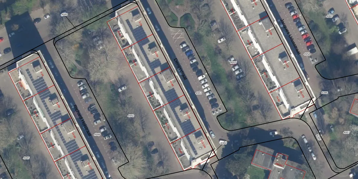 Het perceel waarop Denijsstraat 83 staat heeft een oppervlakte van 4537 m². Dit is een zeer groot perceel. De perceeloppervlakte wordt geregistreerd door het Kadaster. Gedetailleerde informatie over de maten van dit perceel kunt u vinden in het rapport Kadastrale kaart met maatvoering van Denijsstraat 83.