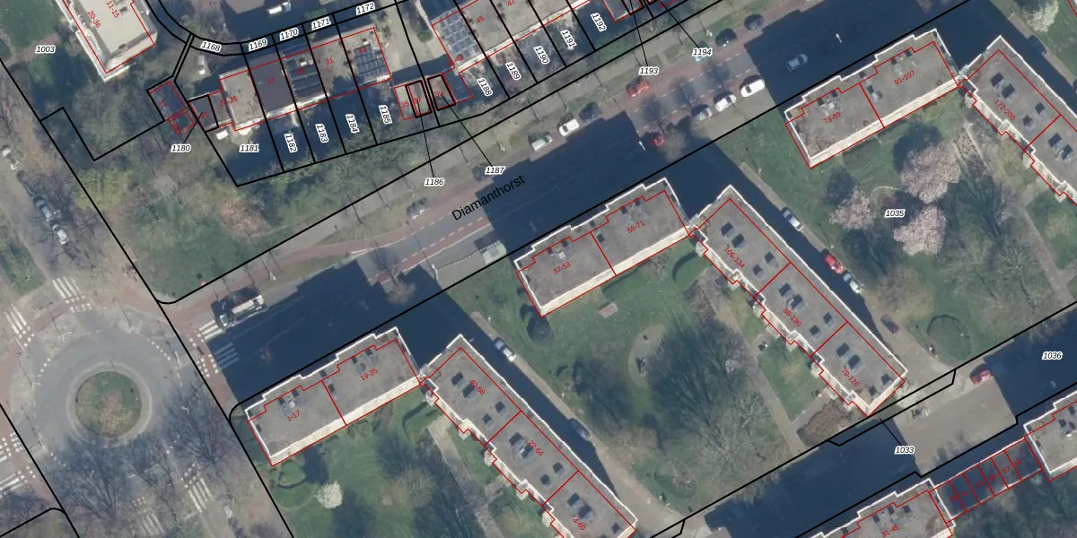 Het perceel waarop Diamanthorst 37 staat heeft een oppervlakte van 1,7 ha. Dit is een zeer groot perceel. De perceeloppervlakte wordt geregistreerd door het Kadaster. Gedetailleerde informatie over de maten van dit perceel kunt u vinden in het rapport Kadastrale kaart met maatvoering van Diamanthorst 37.