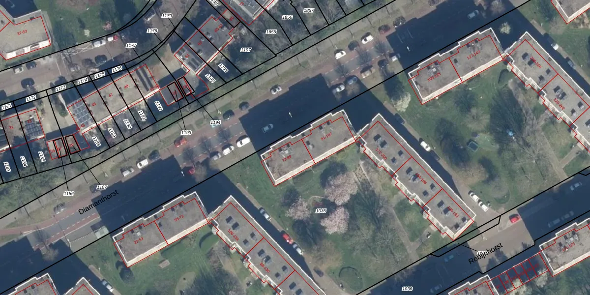 Het perceel waarop Diamanthorst 89 staat heeft een oppervlakte van 1,7 ha. Dit is een zeer groot perceel. De perceeloppervlakte wordt geregistreerd door het Kadaster. Gedetailleerde informatie over de maten van dit perceel kunt u vinden in het rapport Kadastrale kaart met maatvoering van Diamanthorst 89.