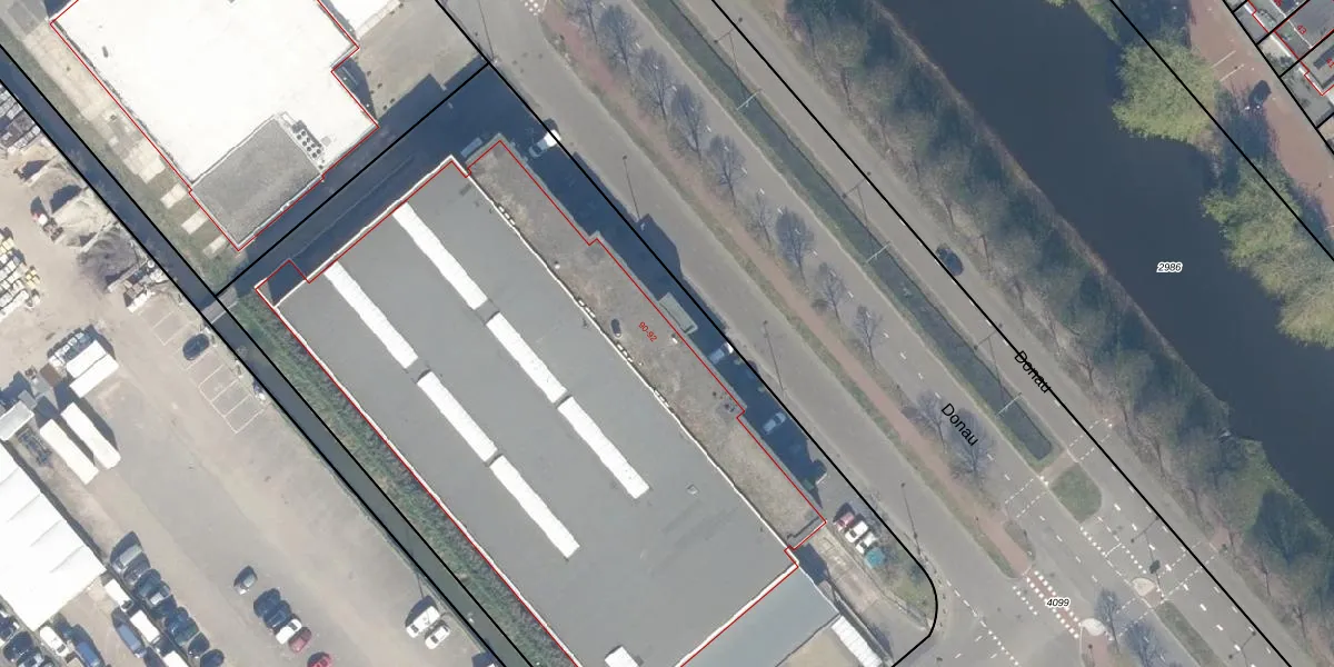 Het perceel waarop Donau 90 staat heeft een oppervlakte van 5840 m². Dit is een zeer groot perceel. De perceeloppervlakte wordt geregistreerd door het Kadaster. Gedetailleerde informatie over de maten van dit perceel kunt u vinden in het rapport Kadastrale kaart met maatvoering van Donau 90.