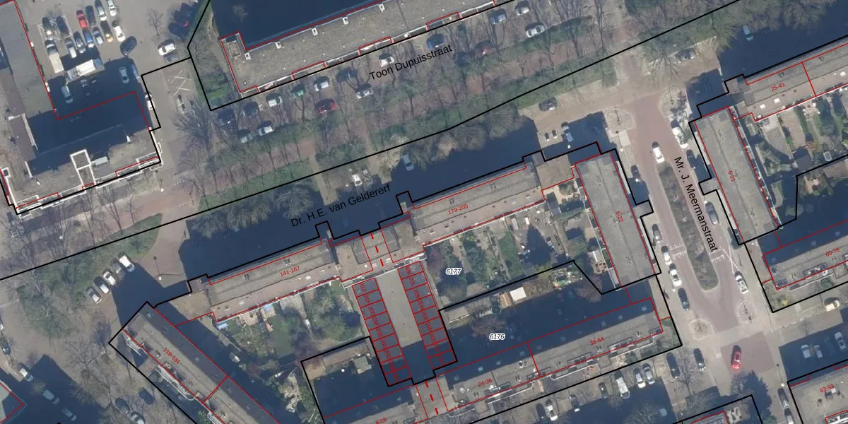 Dr. H.E. van Geldererf 183 is gelegen op kadastraal perceel LDN03M6177. Deze kadastrale aanduiding is uniek en wordt gebruikt door het Kadaster om eigendomsrechten en andere zakelijke rechten vast te leggen. Het perceel maakt onderdeel uit van de kadastrale gemeente Loosduinen.