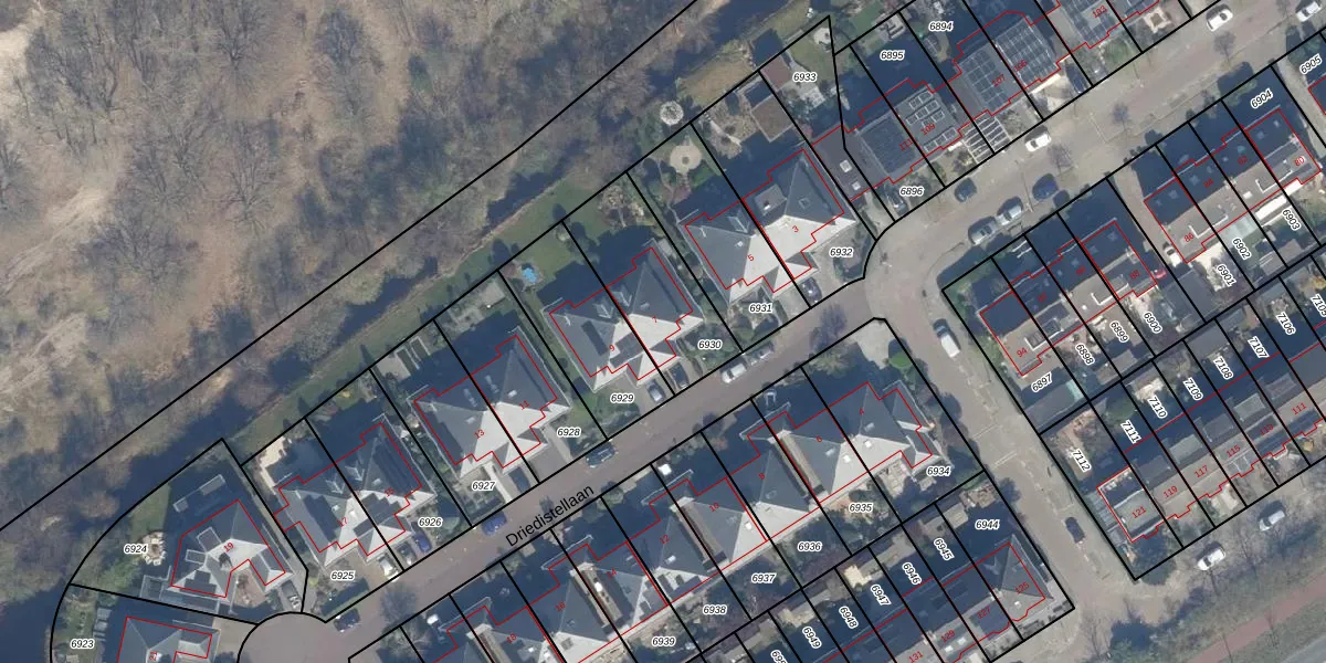 Het perceel waarop Driedistellaan 7 staat heeft een oppervlakte van 389 m². Dit is een groot perceel. De perceeloppervlakte wordt geregistreerd door het Kadaster. Gedetailleerde informatie over de maten van dit perceel kunt u vinden in het rapport Kadastrale kaart met maatvoering van Driedistellaan 7.