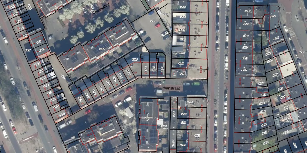 Het perceel waarop Durbanstraat 11 staat heeft een oppervlakte van 87 m². Dit is een klein perceel. De perceeloppervlakte wordt geregistreerd door het Kadaster. Gedetailleerde informatie over de maten van dit perceel kunt u vinden in het rapport Kadastrale kaart met maatvoering van Durbanstraat 11.