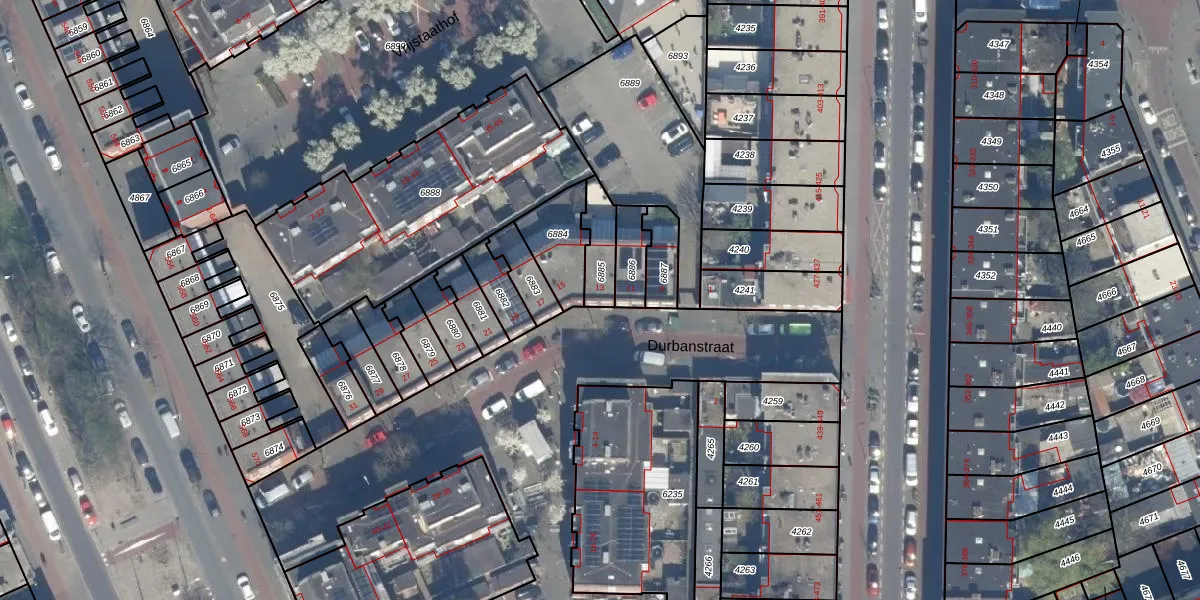 Het perceel waarop Durbanstraat 13 staat heeft een oppervlakte van 101 m². Dit is een middelgroot perceel. De perceeloppervlakte wordt geregistreerd door het Kadaster. Gedetailleerde informatie over de maten van dit perceel kunt u vinden in het rapport Kadastrale kaart met maatvoering van Durbanstraat 13.