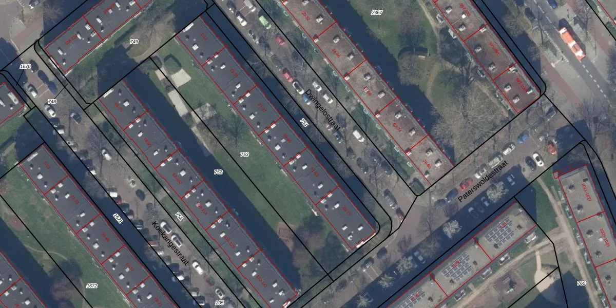 Het perceel waarop Dwingelostraat 55 staat heeft een oppervlakte van 2147 m². Dit is een zeer groot perceel. De perceeloppervlakte wordt geregistreerd door het Kadaster. Gedetailleerde informatie over de maten van dit perceel kunt u vinden in het rapport Kadastrale kaart met maatvoering van Dwingelostraat 55.