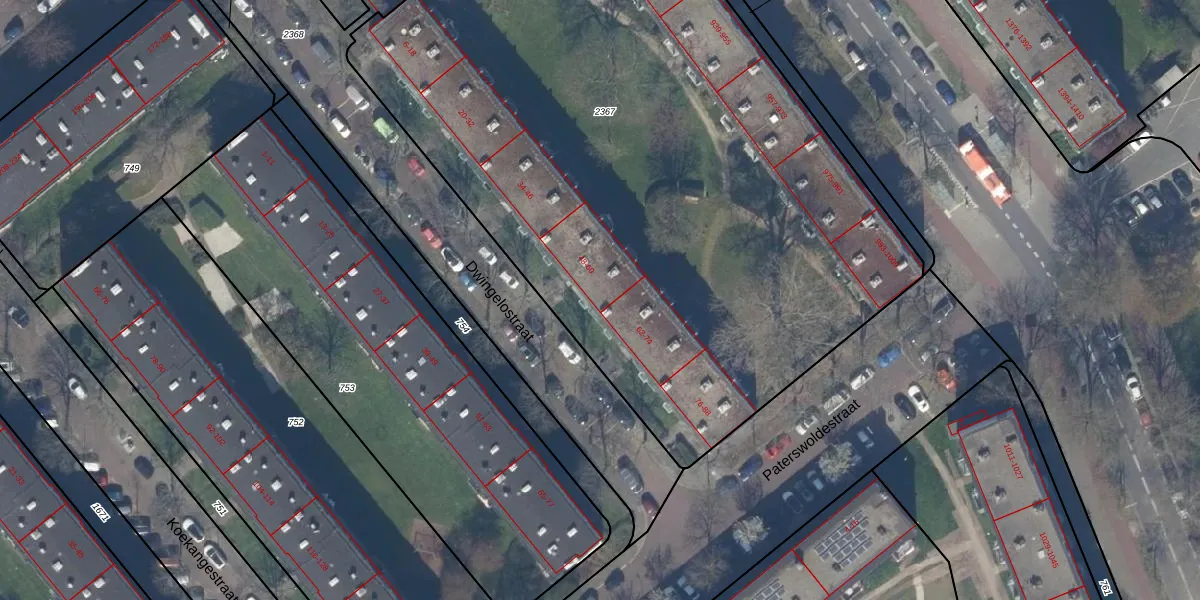Het perceel waarop Dwingelostraat 56 staat heeft een oppervlakte van 6458 m². Dit is een zeer groot perceel. De perceeloppervlakte wordt geregistreerd door het Kadaster. Gedetailleerde informatie over de maten van dit perceel kunt u vinden in het rapport Kadastrale kaart met maatvoering van Dwingelostraat 56.