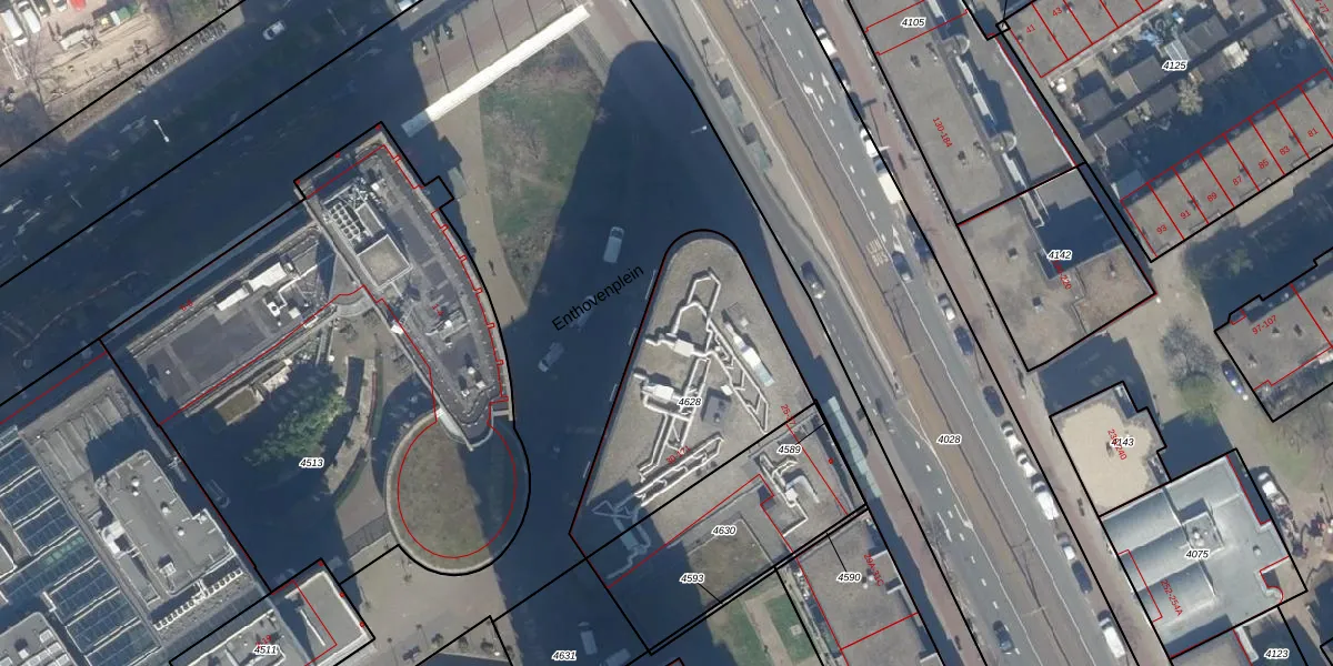 Enthovenplein 56 is gelegen op kadastraal perceel GVH21AD4628. Deze kadastrale aanduiding is uniek en wordt gebruikt door het Kadaster om eigendomsrechten en andere zakelijke rechten vast te leggen. Het perceel maakt onderdeel uit van de kadastrale gemeente 's-Gravenhage.