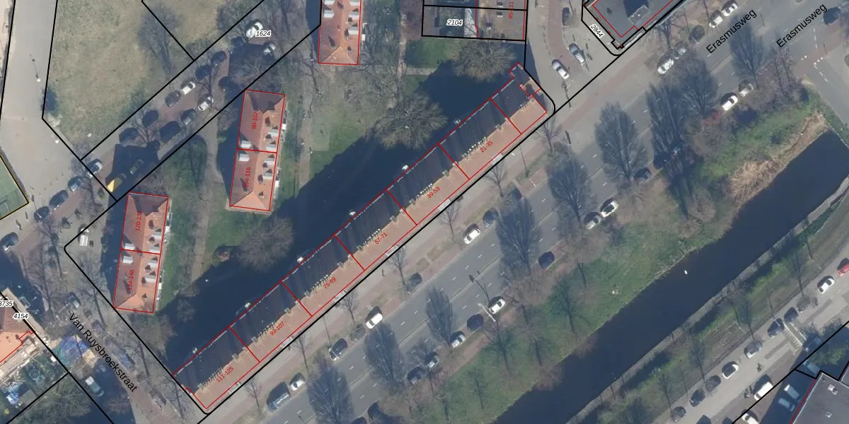 Het perceel waarop Erasmusweg 49 staat heeft een oppervlakte van 9055 m². Dit is een zeer groot perceel. De perceeloppervlakte wordt geregistreerd door het Kadaster. Gedetailleerde informatie over de maten van dit perceel kunt u vinden in het rapport Kadastrale kaart met maatvoering van Erasmusweg 49.