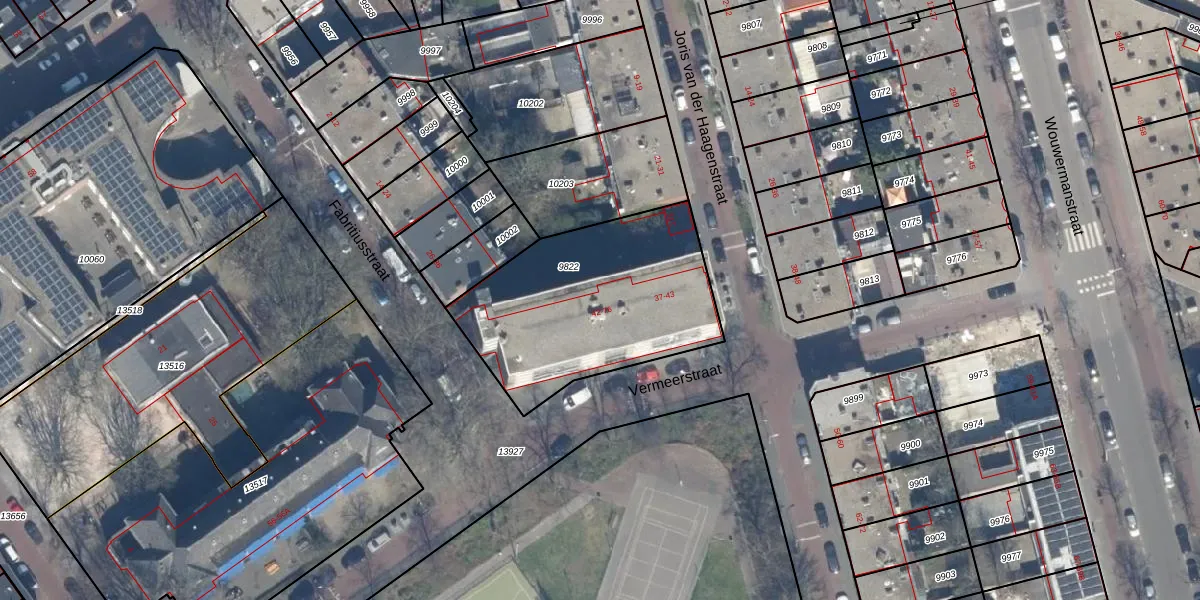 Het perceel waarop het adres ligt is GVH08-L-9822. De afkorting 'GVH08' staat voor kadastrale gemeente 's-Gravenhage. De oppervlakte van het perceel is 956 m². Dat is groter dan gemiddeld in 's-Gravenhage, waar de gemiddelde perceeloppervlakte op 468,2 m² ligt. Het grootste perceel in de kadastrale gemeente is 3,8 ha. Het kleinste perceel heeft een oppervlakte van 0 m². Op het perceel liggen in totaal 23 adressen. De huidige grenzen van het perceel zijn digitaal in de Basisregistratie Kadaster (BRK) geregistreerd op 31-10-2007.