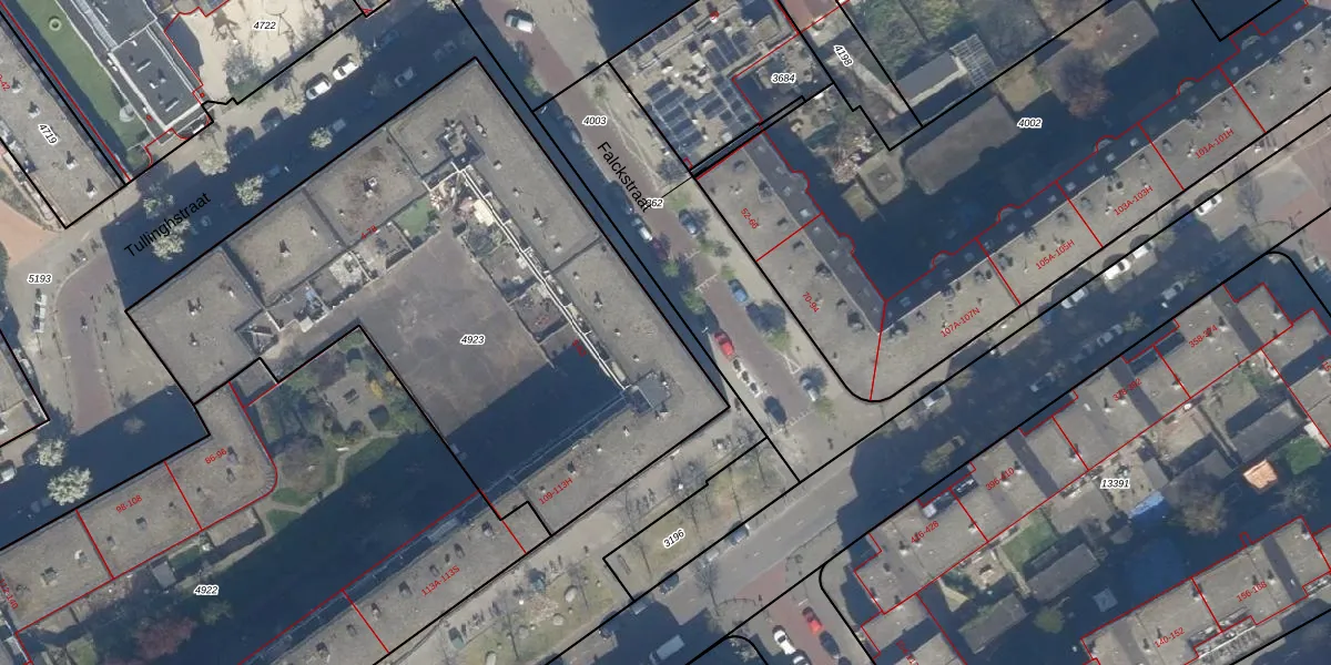 Het perceel waarop Falckstraat 35 staat heeft een oppervlakte van 2973 m². Dit is een zeer groot perceel. De perceeloppervlakte wordt geregistreerd door het Kadaster. Gedetailleerde informatie over de maten van dit perceel kunt u vinden in het rapport Kadastrale kaart met maatvoering van Falckstraat 35.